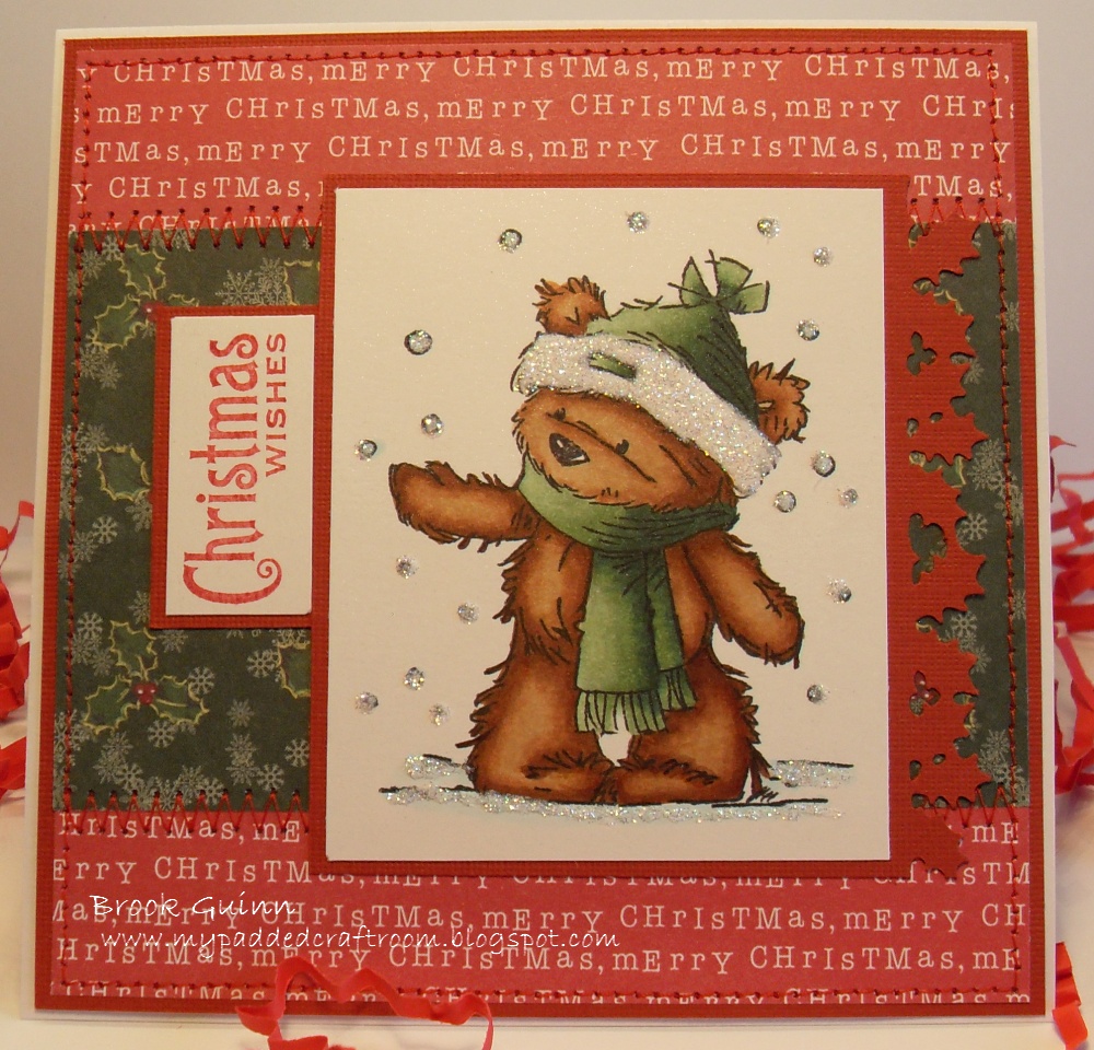 I am trying some different browns on these stamps and love the different looks that I'm getting. For my card I used the James Bear stamp from Lili of the Valley as well as a sentiment stamp from Waltzingmouse Stamps. The papers are from The Paper Studio and Paper Pizazz as well as the Cryogen White on which he is stamped. I machine stitched the first layer (Even did the zig zag stitch, which I haven't done in a while.). I colored him with Copics (E37, E33, E31, G28, G24, G21, G20, B000), used my MS holly border punch, and added some glitter to his hat, the falling snow and the snow on the ground. Very quick and easy card.